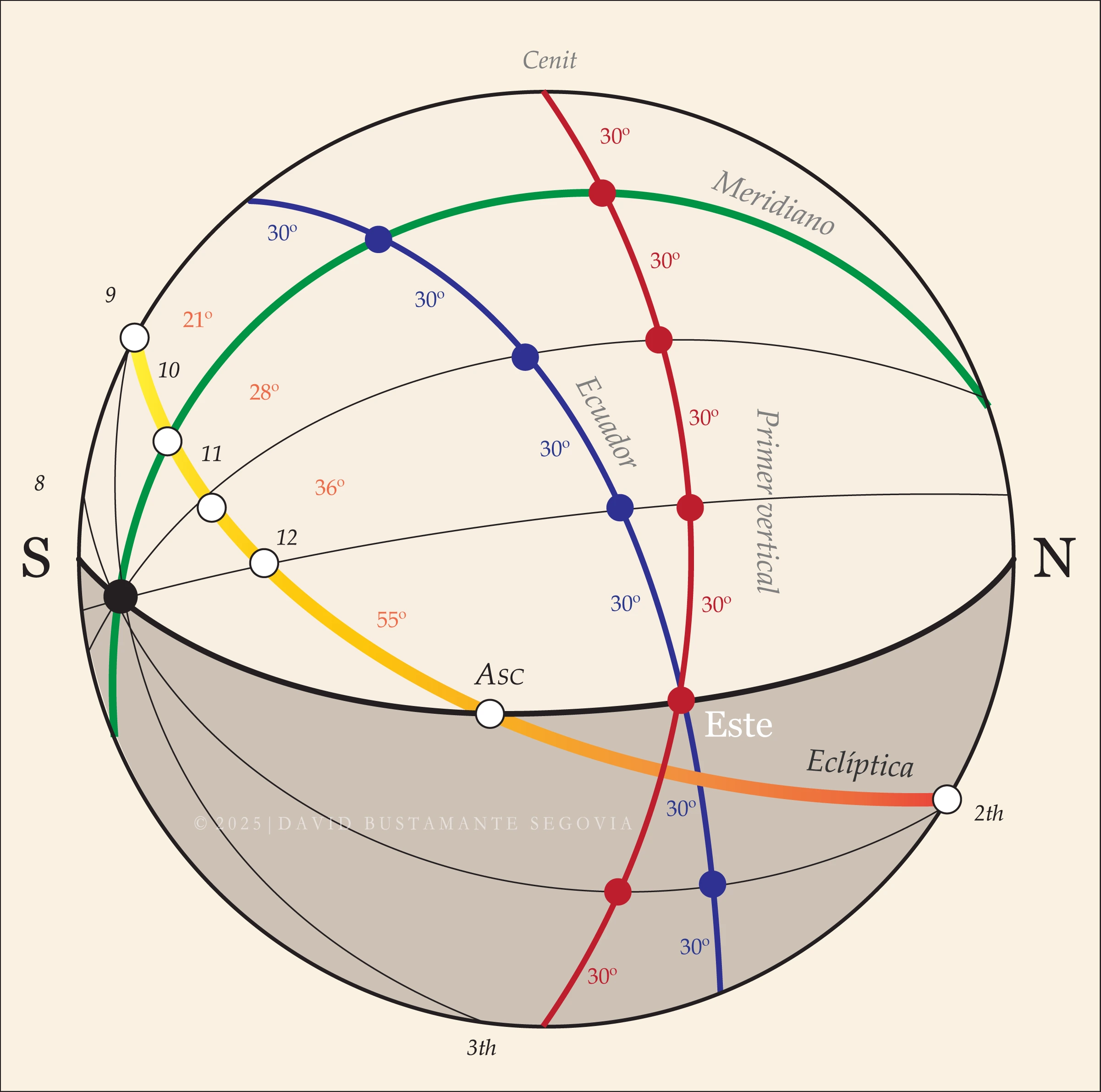 Ilustración esférica de tres marcos de referencia: eclíptica (fuente natural no lineal de cálculo cuspal), ecuador celeste (fuente lineal), primer vertical (fuente lineal).