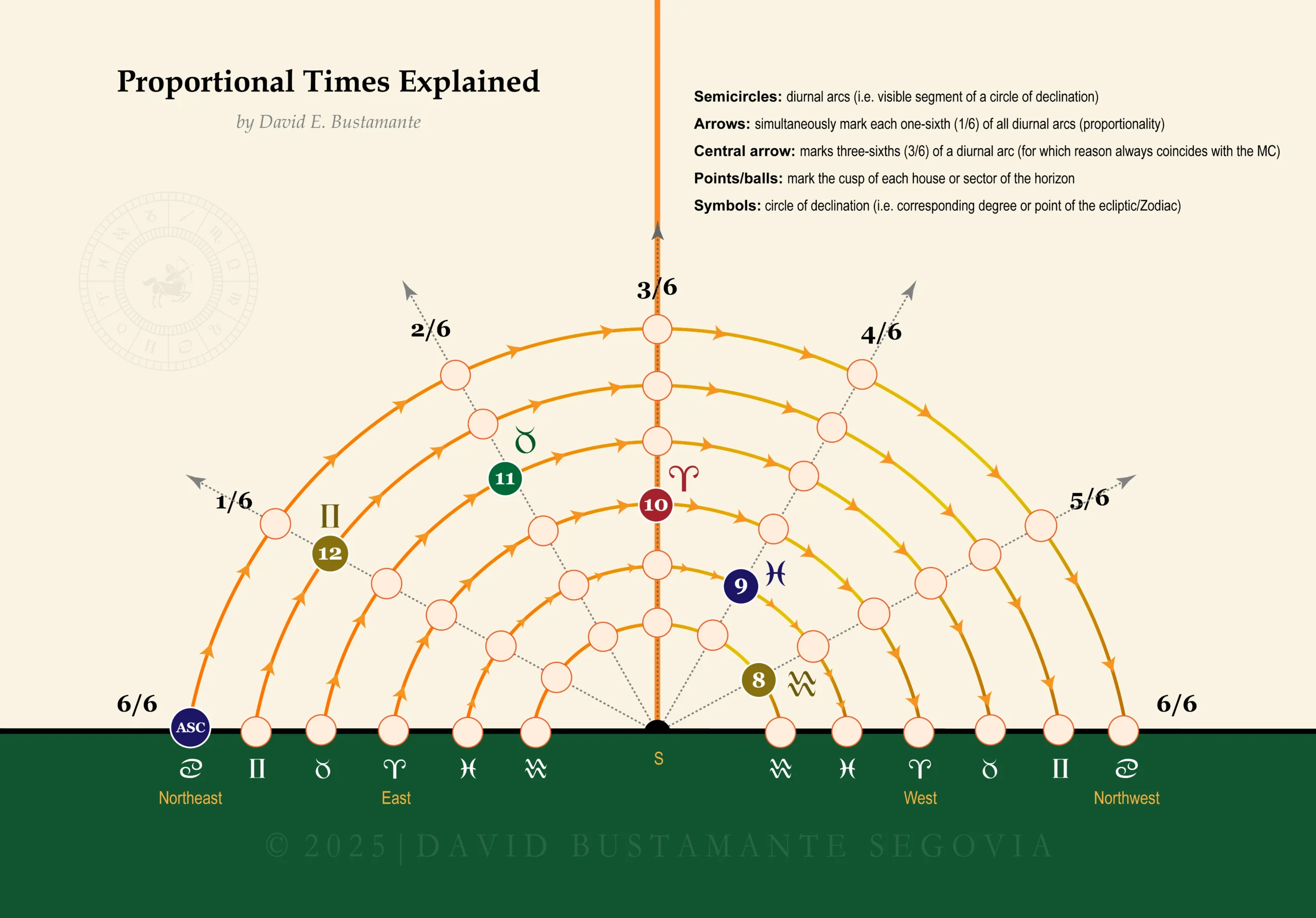 The sole engine which drives the houses is the Earth’s diurnal rotation (the daily apparent movement of the ecliptic). This physical rotation is the single, non-negotiable, observable reality or phenomenon that determines all positions, that is, that produces both the angular axes or cusps (ASC, MC) and the intermediate cusps or subaxes. They are distinguished solely by the moment at which the fraction of their arc is measured. If the ASC is the degree which cuts the horizon at that moment (time 0), the cusp of the twelfth house is then the degree that would have cut the horizon had we gone back in time one-sixth of the duration of that house. Both positions constitute ‘time markers’ (Houlding, 1995/2003) along the same path of rotation. Separating them, therefore, lacks logical, physical, or geometric basis, the sole explanation resting upon the avoidance of the complexity of a simultaneously uninterrupted calculation (which explains the use of the celestial equator in the case of Regiomontanus, or of the prime vertical in the case of Campano; and of a single circle of declination/diurnal arc in the case of Alcabitius and Koch).