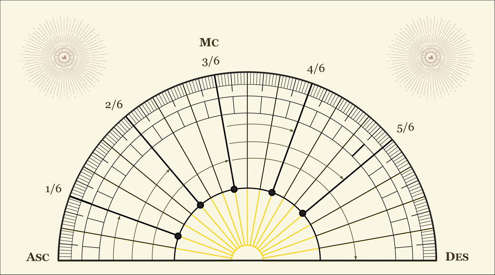 Debido a que el postulado filosófico tradicional establece la necesidad de partir o dividir el horizonte en seis segmentos de la misma longitud sobre el plano del horizonte local y en seis segmentos de la misma longitud debajo del mismo plano con el fin de intervenir seis puntos eclípticos (grado zodiacales) diferentes, Ptolomeo, como correctamente lo describe su traductor F.E. Robbins (1940, Loeb, pág. 286), se acusó determinar cuáles seis puntos de la eclíptica se encuentran cumpliendo con una, dos, tres, cuatro, cinco y seis sextas partes de su propio arco diurno. (Todo ASC y todo MC, por ejemplo, constituye exactamente seis sextas partes y tres sextas partes de su propio arco diurno.)